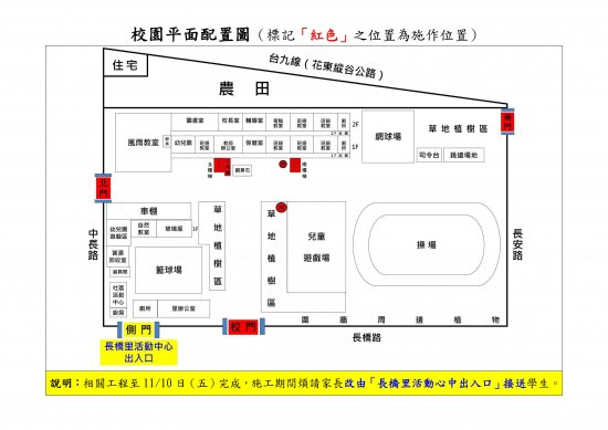 1.『校門口工程』從 9/21日起,預計 11/10日完工,進出改由長橋里活動中心出入口接送,造成家長不便,敬請見諒!【導護老師會協助引導】