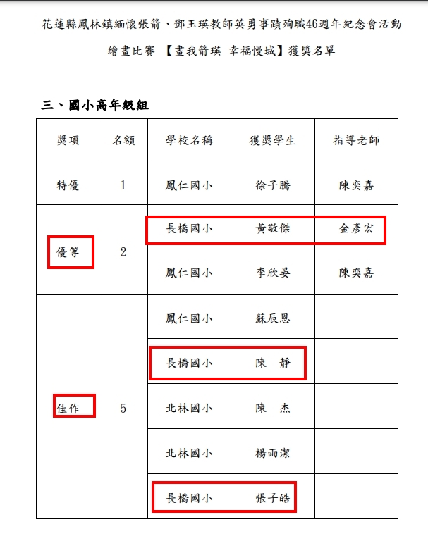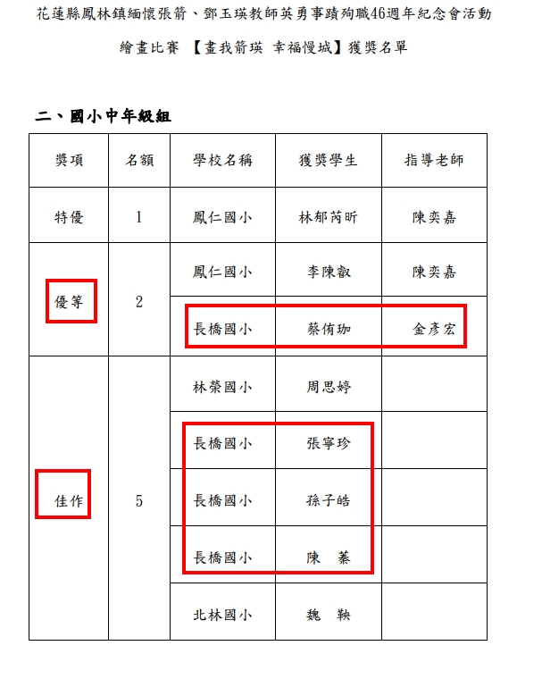 花蓮縣鳳林鎮緬懷張箭、鄧玉瑛教師英勇事蹟殉職46週年紀念會活動繪畫比賽【畫我箭瑛 幸福慢城】獲獎名單