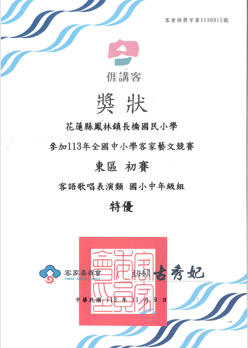 恭喜長橋低年級學生獲得112年全國中小學客家藝文競賽【特優】