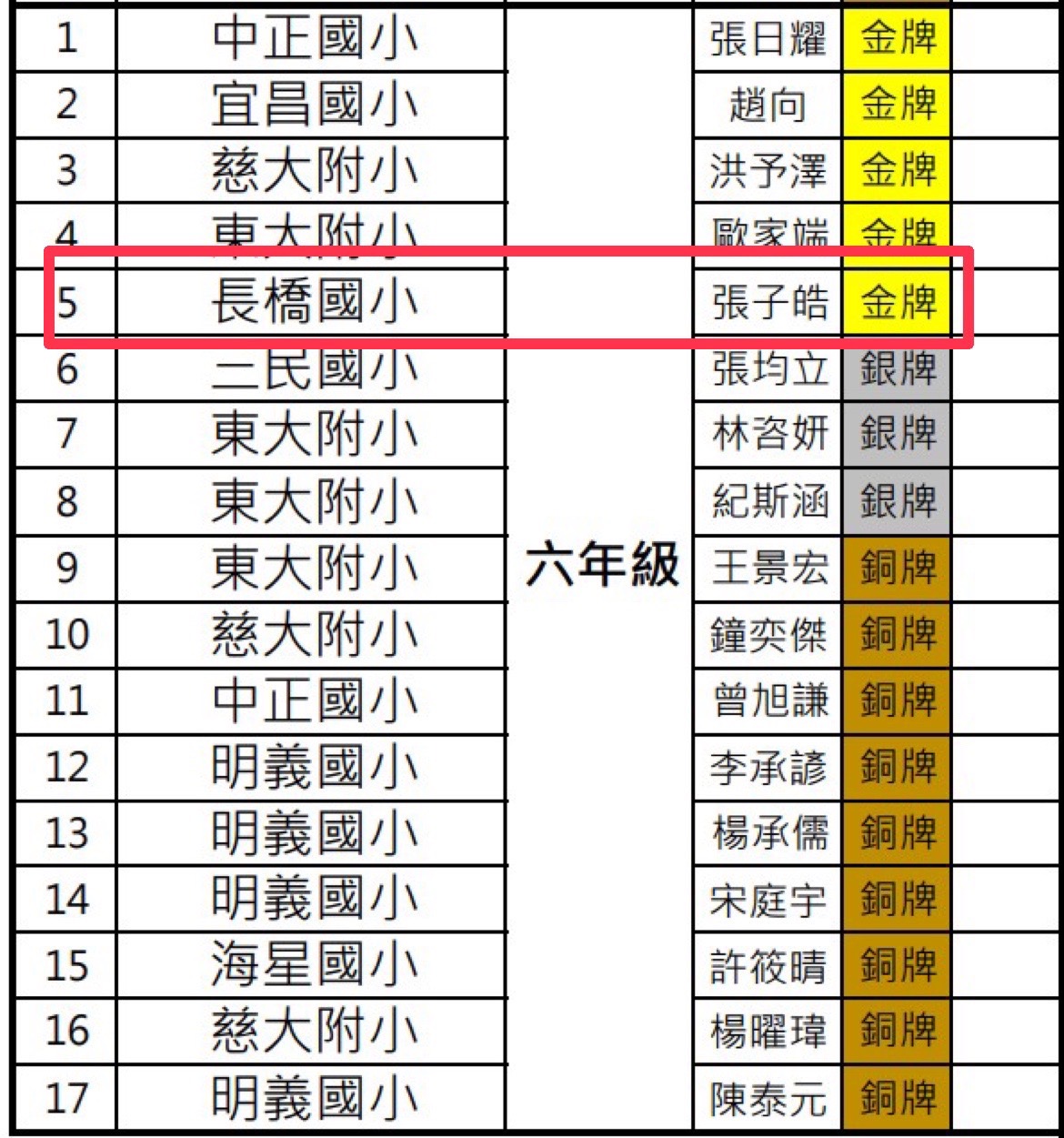 恭喜六甲張子皓同學榮獲2023年第十九屆更生盃數學競賽-金牌。
