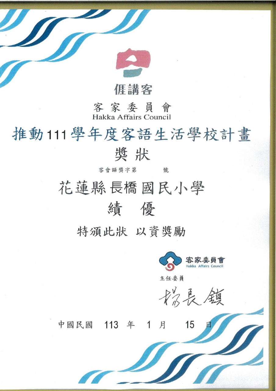 恭賀長橋國小榮獲111學年度客語生活學校績優