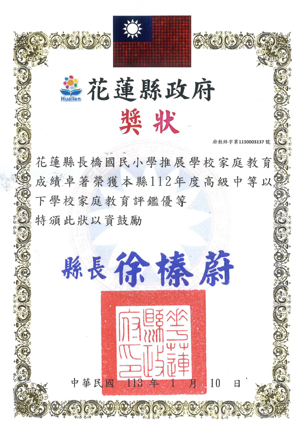恭賀長橋國小榮獲112學年度家庭教育評鑑優等