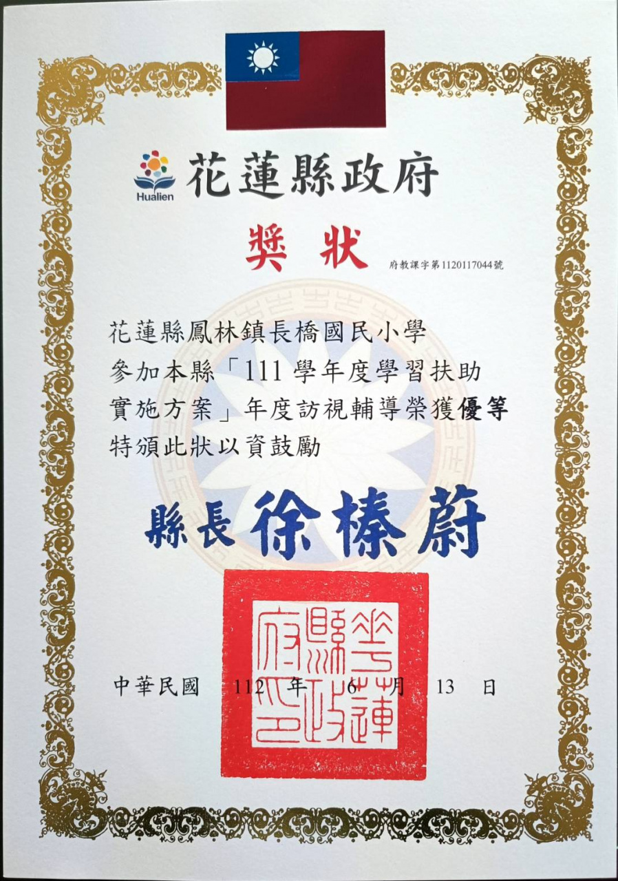 恭賀長橋國小榮獲111學年度學習扶助訪視優等