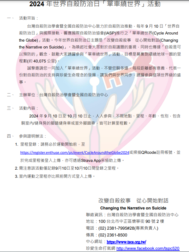 一、響應 9 月 10 日「世界自殺防治日」,為呼籲社會大眾重視自殺防治的議題,推廣珍愛生命理念,配合國際自殺防治協會宣傳 2024 年世界自殺防治日「單車繞世界」活動。
