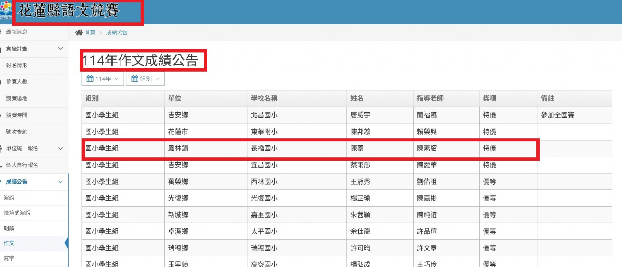 狂賀六年級陳蓁同學榮獲114年花蓮縣「語文競賽」作文組特優