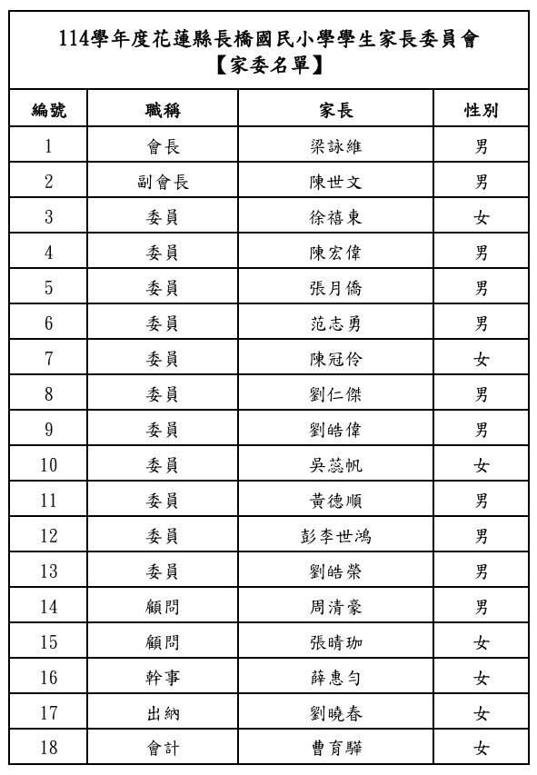 114學年度花蓮縣長橋國民小學學生家長委員會【家委名單】