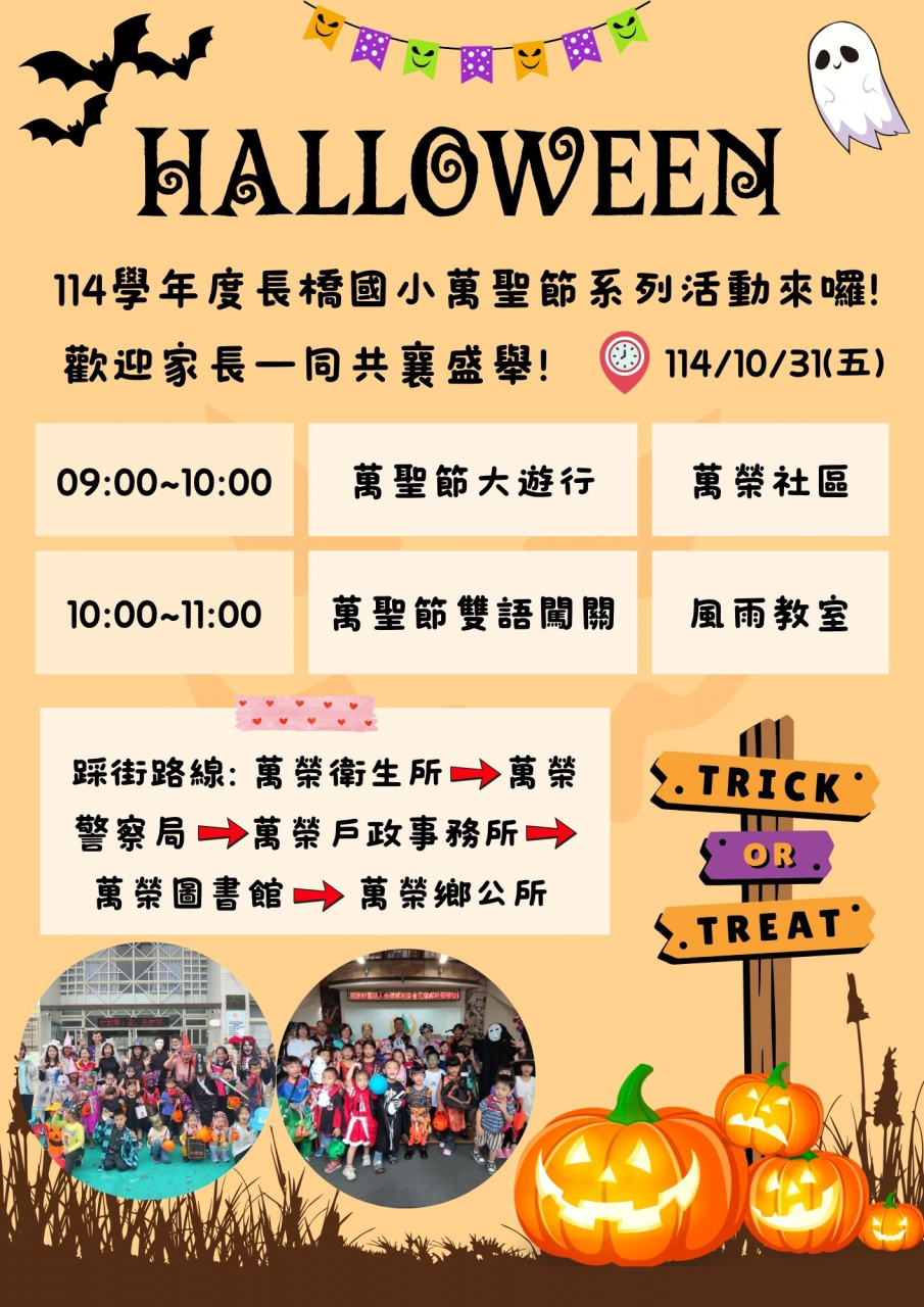 長橋國小將於10/31(五)舉辦一系列的萬聖節活動,孩子將精心裝扮遊行,也將有玩中學的萬聖節雙語闖關,精彩可期的活動讓孩子們體驗西方節慶氣息、開拓文化視野,以下為活動時間: