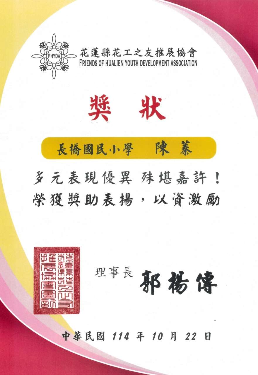 恭喜!六年級陳蓁同學榮獲「青少年多元表現優秀學生」