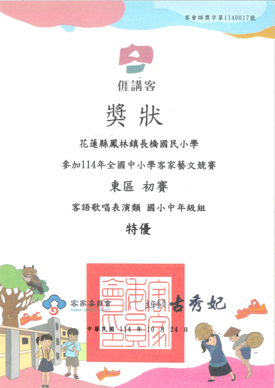 狂賀!長橋國小榮獲114年全國中小學客家藝文競賽-東區初賽【中年級組客語歌唱表演類】特優